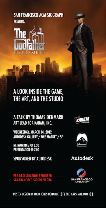 Poster design for an SF ACM SIGGRAPH talk at Autodesk Gallery, featuring Thomas Denmark, Art Lead for Kabam, Inc., presenting a behind the scenes look at the game "The Godfather: Five Families" which was inspired by the Paramount movies.